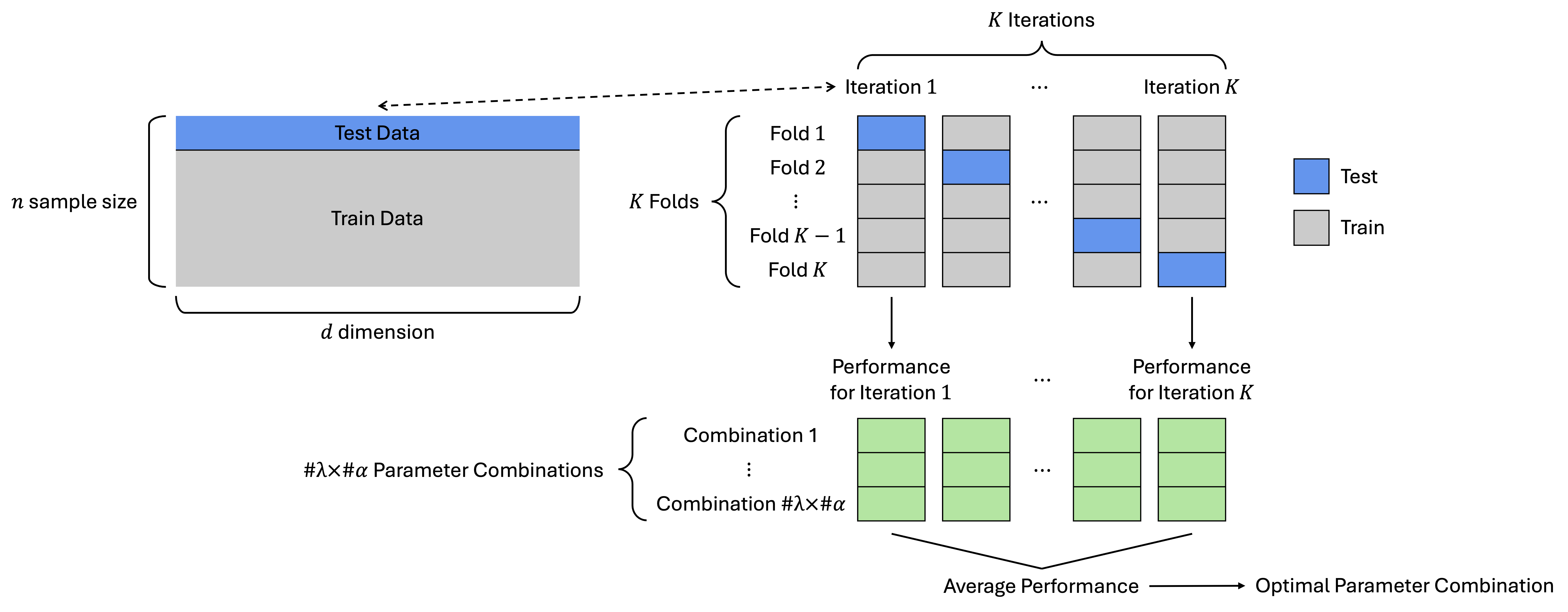 Figure 1 illustrates the \(K\)-fold cross-validation procedure used for tuning the parameters \(\lambda\) and \(\alpha\). The notation \(\#\lambda\) and \(\#\alpha\) denotes the number of candidate values considered for \(\lambda\) and \(\alpha\), respectively, forming a grid of \(\mathrm{\#}\lambda \times \mathrm{\#}\alpha\) total parameter combinations. For each of the \(K\) iterations, negative log-likelihood loss is evaluated for all parameter combinations, yielding \(K\) performance values per combination. The optimal parameter pair is selected as the one achieving the lowest average loss across the \(K\) iterations.