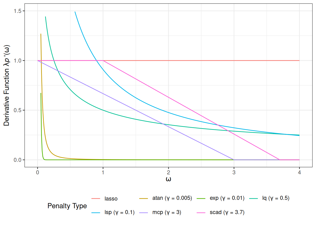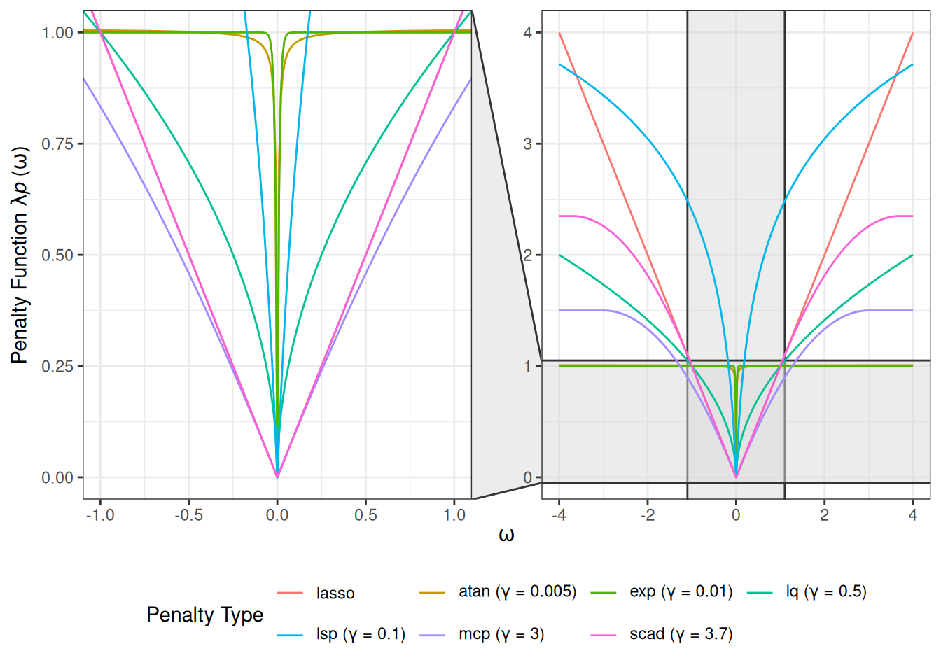penalties <- c("atan", "exp", "lasso", "lq", "lsp", "mcp", "scad")